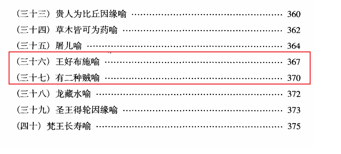 此處「有二種賊」前後文義不連續。「有二種賊」處應是一個新的譬喻,即第三十七喻。整部經的譬喻總數來到四十個。据《佛典譬喻經全集》 ISBN 978-7-229-00269-5 亦作此。
