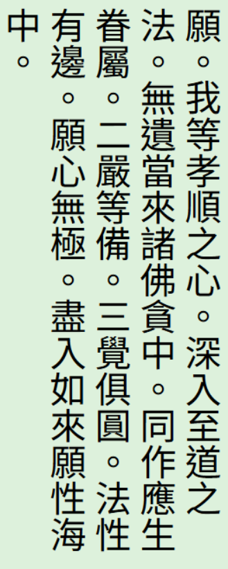 《增修教苑清規》卷2:「伏願我等,孝順之心深入,至道之法無遺,當來諸佛會中,同作應生眷屬,二嚴等備,三覺俱圓,法性有邊,願心無極,盡入如來願性海中。」(CBETA 2025.R2, X57, no. 968, p. 336a17-18 // R101, p. 763a5-6 // Z 2:6, p. 382a5-6)