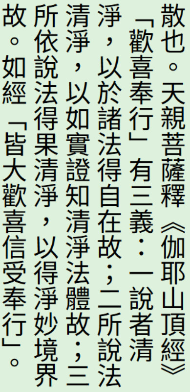 《金光明最勝王經疏》卷2〈2 如來壽量品(二本)〉:「準《文殊所問經論》云「三種義故歡喜奉行:一說者清淨,以於諸法得自在故;二所說清淨,以如實[8]知清淨法體故,又與初中後等十種淨勝相應故;三依所說法得果清淨,以得妙境界故。」」(CBETA 2025.R2, T39, no. 1788, p. 203b18-22)[8] 知【大】,智【聖】