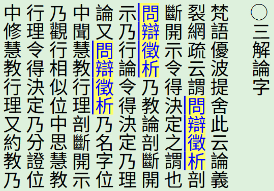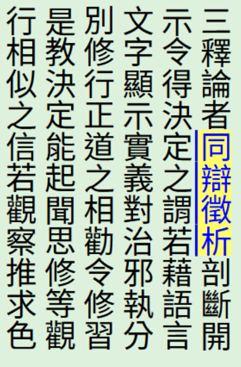 卷一「三釋論者同辯徵析剖斷開示令得決定之謂」,此中「同」字是否應為「問」字?